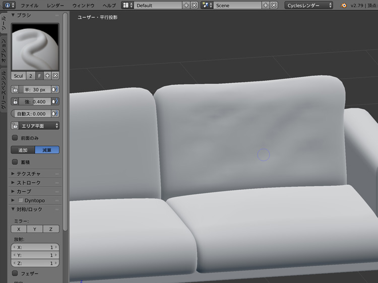 ブラシの半径は好みの大きさで大丈夫ですが、影響力をやや弱めにすると良い感じのシワをつけることができます。また、減算を選択するとクッションをへこませることができます。