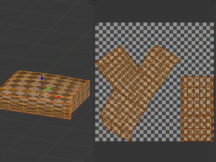 クッションを「A」で全選択して、「U」+「展開」でUV展開します。これでUV展開できました。左側のウィンドウをテクスチャ表示にすると、どのようにテクスチャが貼られるかを確認できます。