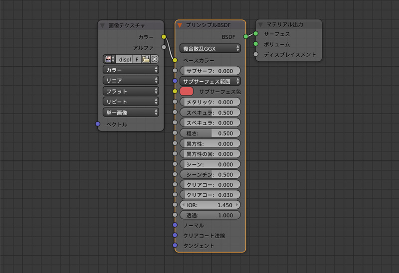 画像テクスチャをプリンシプルBSDFのベースカラーに接続して、テクスチャ画像を選択、プリンシプルBSDFの透過を1.0に設定します。