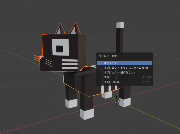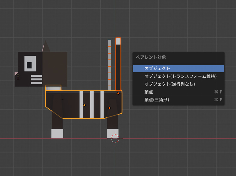 また、しっぽ、ボーン、体の順番に選択、「Ctrl」+「P」で「オブジェクト」をクリックしてペアレント設定します。