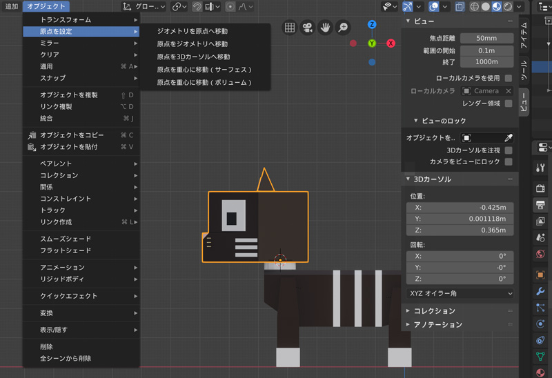 「N」でサイドバーを表示させ、ビュータブで原点に設定したい場所に3Dカーソルを移動します。トップバーの下の「オブジェクト」から「原点を設定」を選択して、「原点を3Dカーソルへ移動」をクリックして原点を設定します。