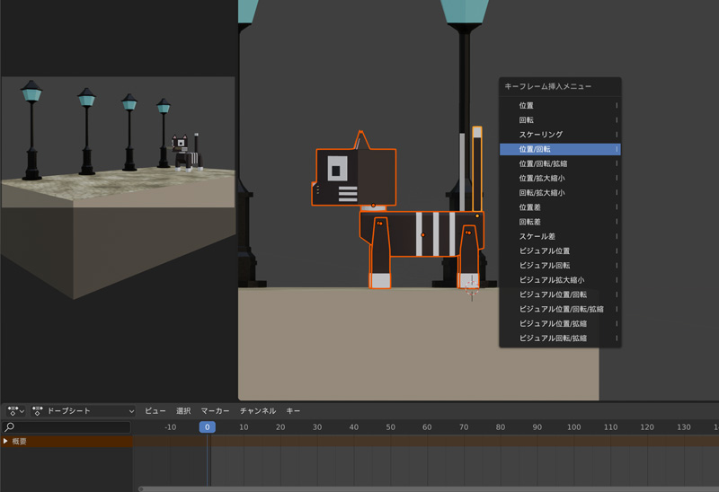 位置と回転をアニメーションしたかったので「位置/回転」を選択しましたが、キーフーレムの下の「キーイング」のアクティブキーイングセットを「LocRot」にすると「i」だけで「位置/回転」のキーフレームを追加することができるようになります。