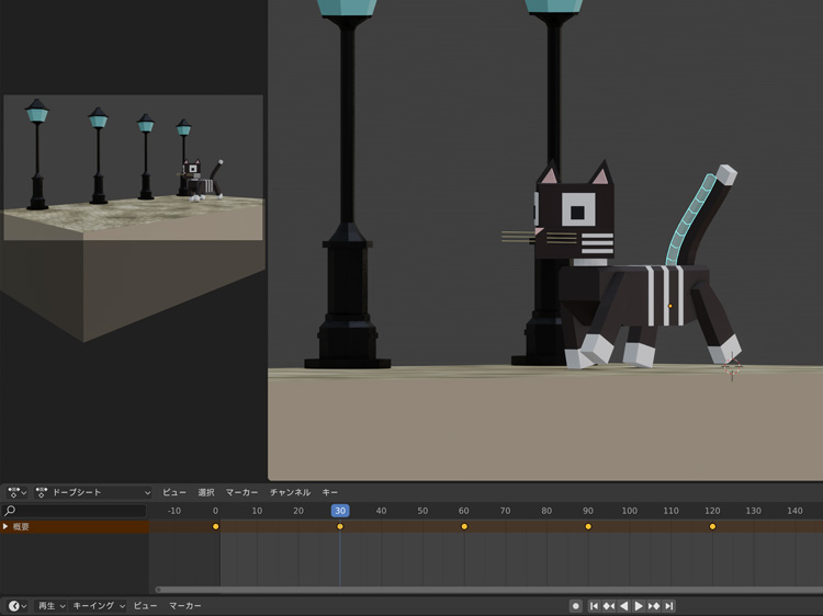 しっぽを選択してポーズモードにし、30フレームごとに「R」+「X」でしっぽを変形させてキーフレームを挿入します。これでアニメーションの完成です。