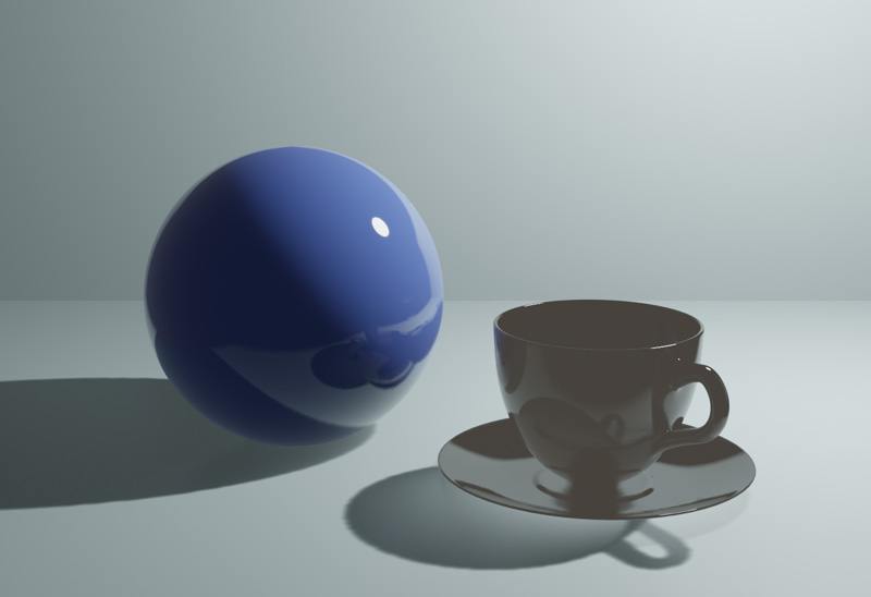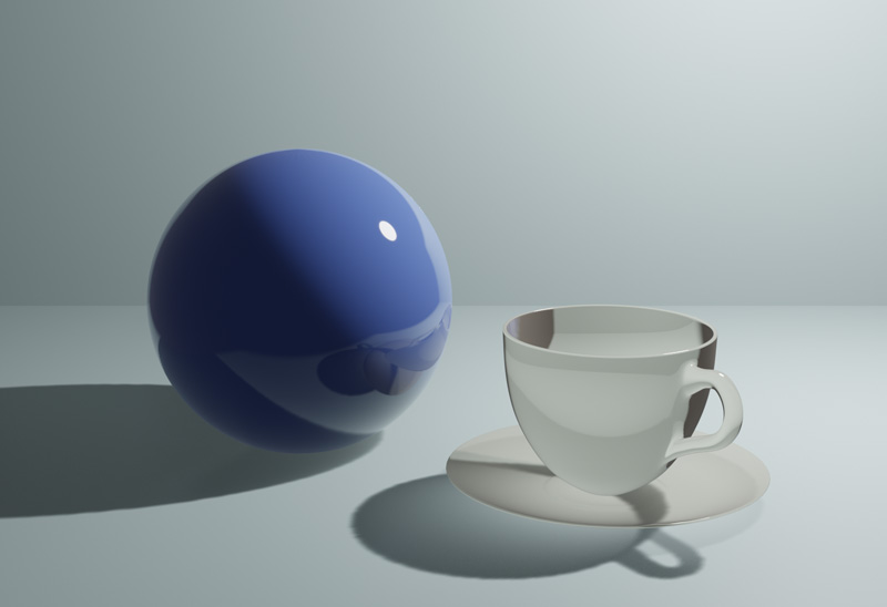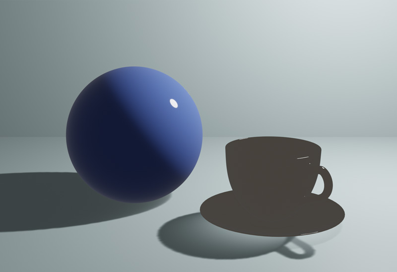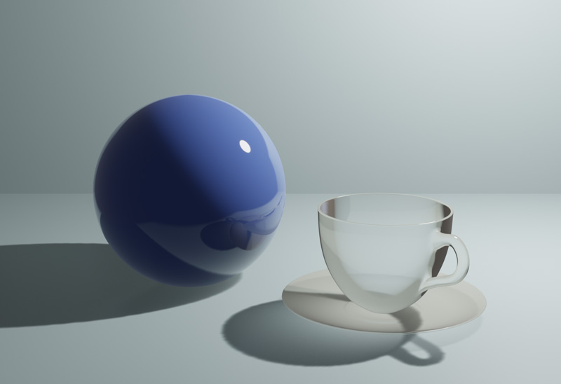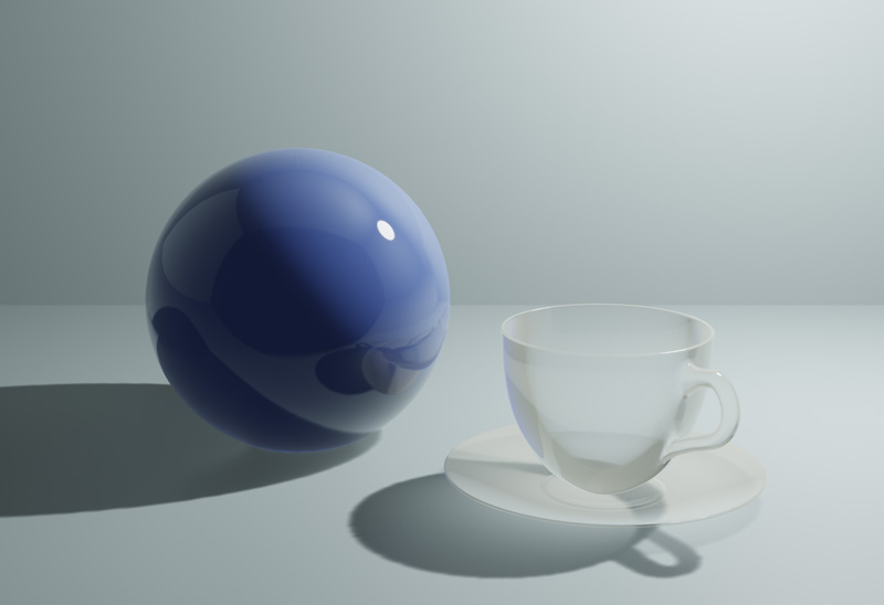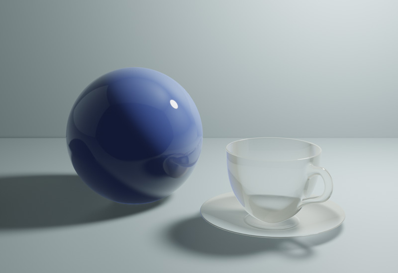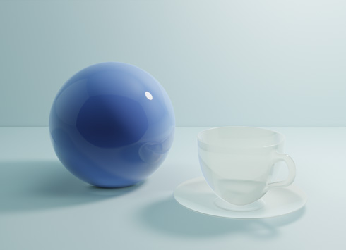 CyclesでレンダリングしたUV球とコーヒーカップを、Eeveeでレンダリングします。レンダリングエンジンをEeveeに変更すると、ガラスは透過されずシーンが暗くなりました。これは、Eeveeは初期設定では反射や屈折、間接照明が有効になっていないためです。