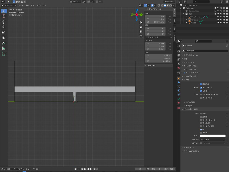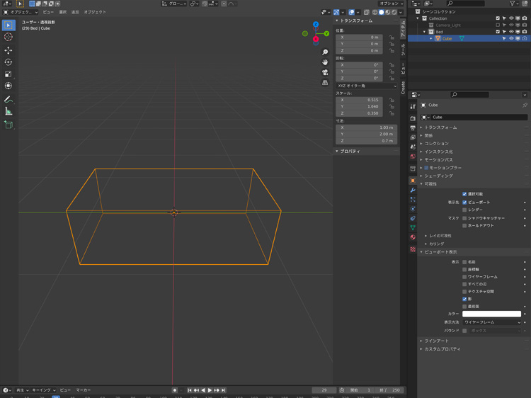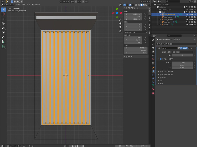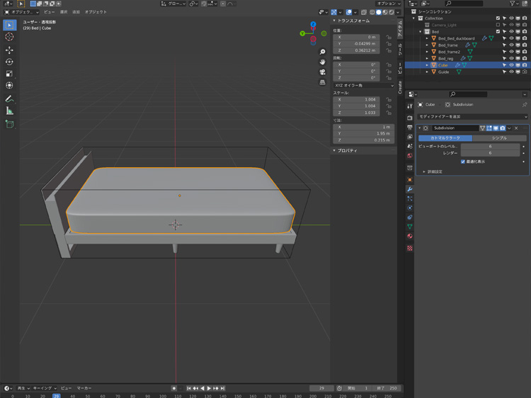 他のBlenderファイルに配置しやすいように、アウトライナーのCollectionにBedを追加して、オブジェクトはBedの中に整理していきます。