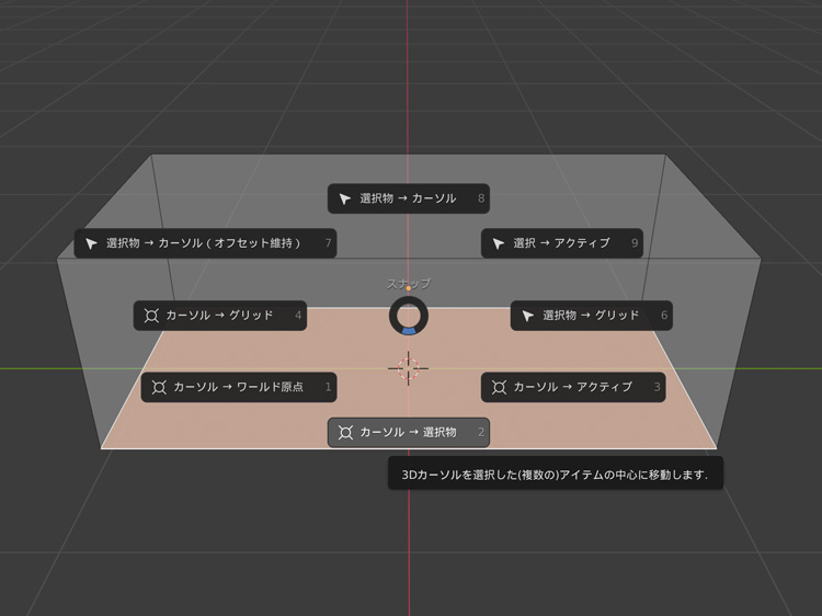「Shift」+「S」+「カーソル→選択物」で3Dカーソルを底面に移動します。オブジェクトモードで右クリックして、「原点を設定」の「原点を3Dカーソルへ移動」で原点を底面に移動します。