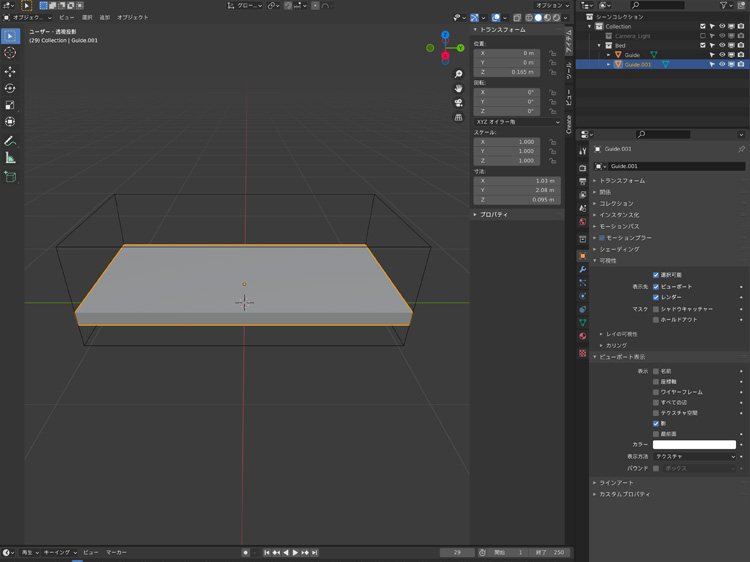 ガイドオブジェクトを「Shift」+「D」で複製し、Zを0.095mにします。オブジェクトプロパティで可視性のレンダーのチェックを入れ、ビューポート表示をテクスチャにします。(ガイドオブジェクトを複製したさいは毎回この作業をします。)