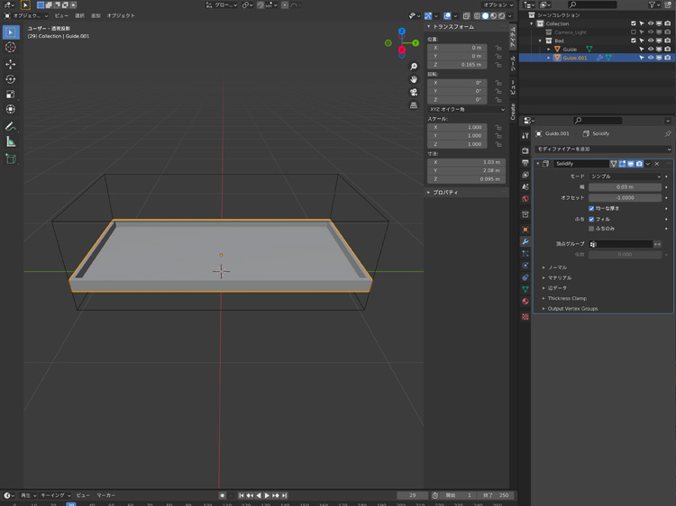 オブジェクトモードにして、「Ctr」+「A」でオブジェクトのスケールを適用し、ソリッド化 モディファイアーを設定します。ソリッド化 モディファイアーは、均一な厚さにチェックを入れて幅は3cmに設定します。