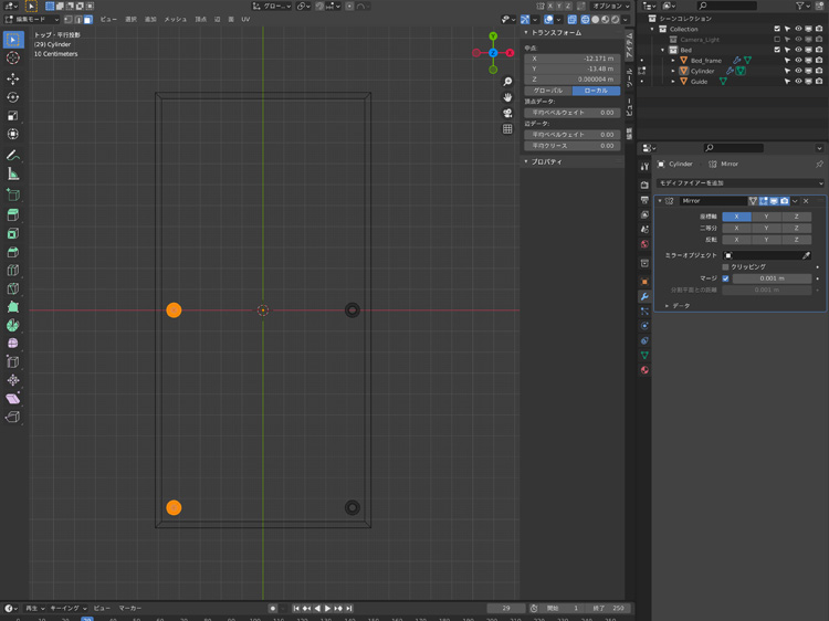 編集モードで、「G」+「X」で円柱をサイドフレームの左側に移動します。「Shift」+「D」で円柱を複製し、「G」+「Y」で円柱をサイドフレームの手前側に移動します。
