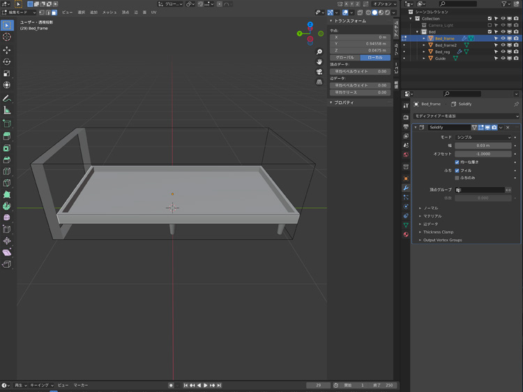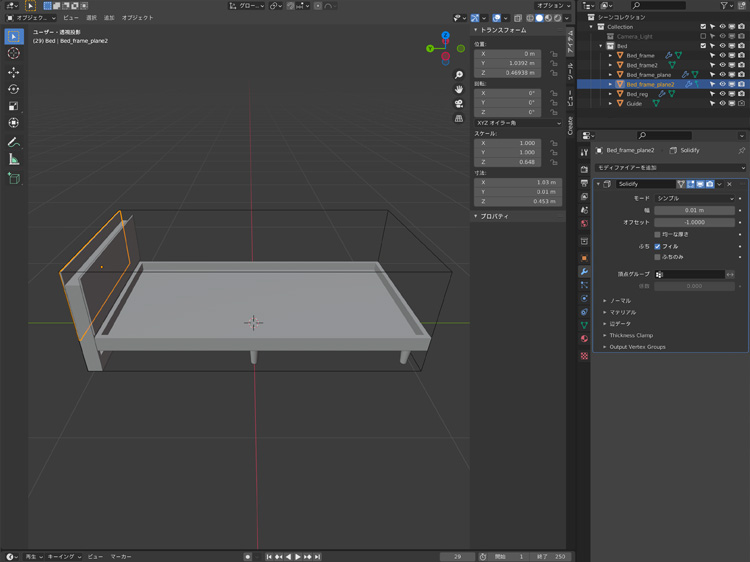 ベッドボードをオブジェクトモードで、「Ctr」+「A」でオブジェクトのスケールを適用し、ソリッド化 モディファイアーを設定します。ソリッド化 モディファイアーは、均一な厚さにチェックを入れて幅は3cmに設定します。