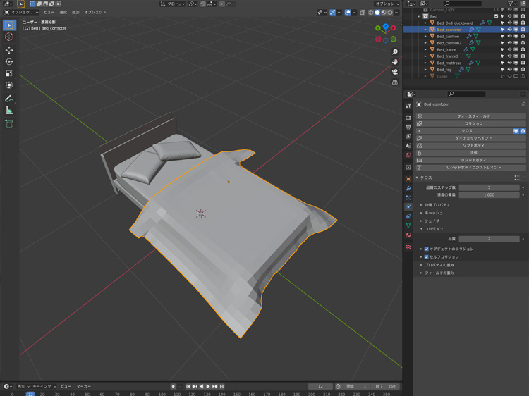 掛け布団に物理演算プロパティのクロスを設定し、セルフコリジョンにチェックを入れます。また、フィールドの重みの重力を2.0に設定します。