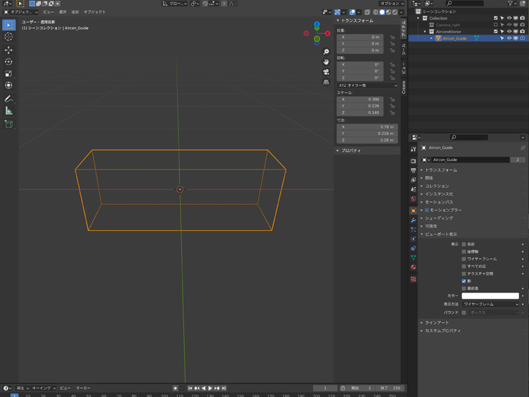 「Shift」+「A」で立方体を追加し、Xを0.78m、Yを0.218m、Zを0.28mにします。