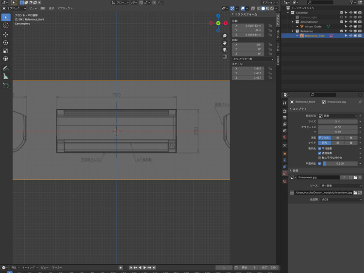 「Shift」+「A」+「画像」で二面図を追加し、二面図の不透明度を0.1に設定、「S」で二面図とガイドオブジェクトを合わせます。
