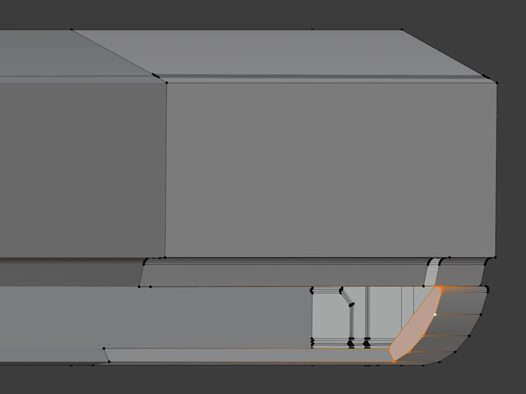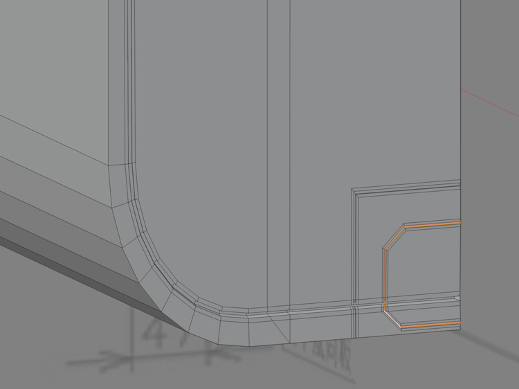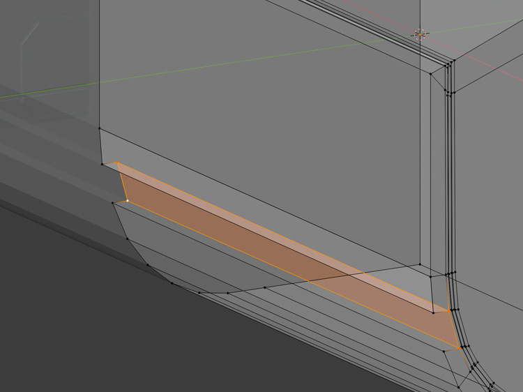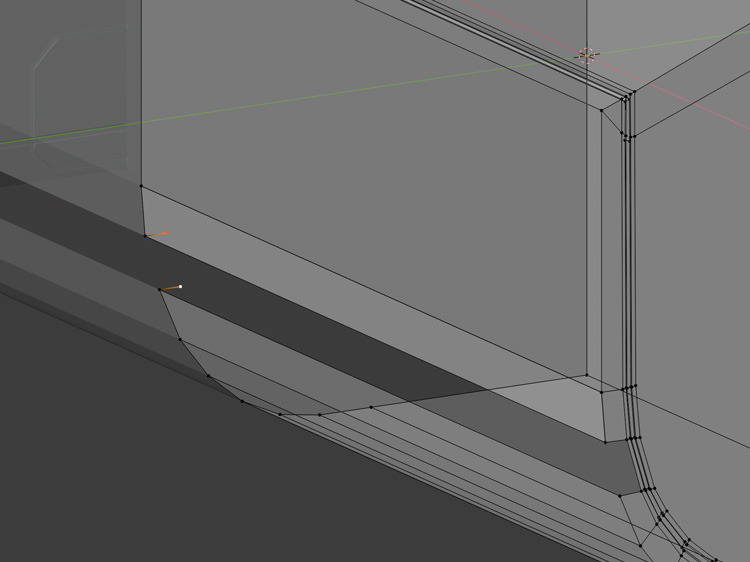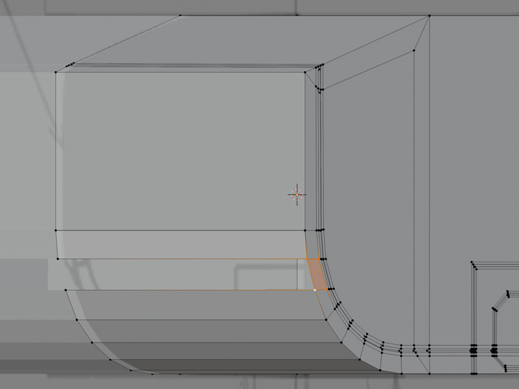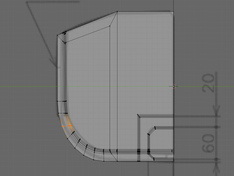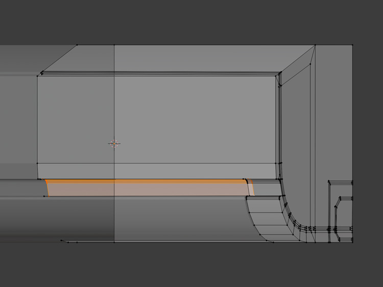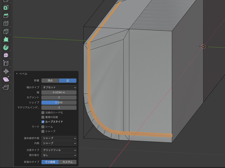 窪みの奥の辺など、必要な辺に「Ctr」+「B」でベベルをかけます。
