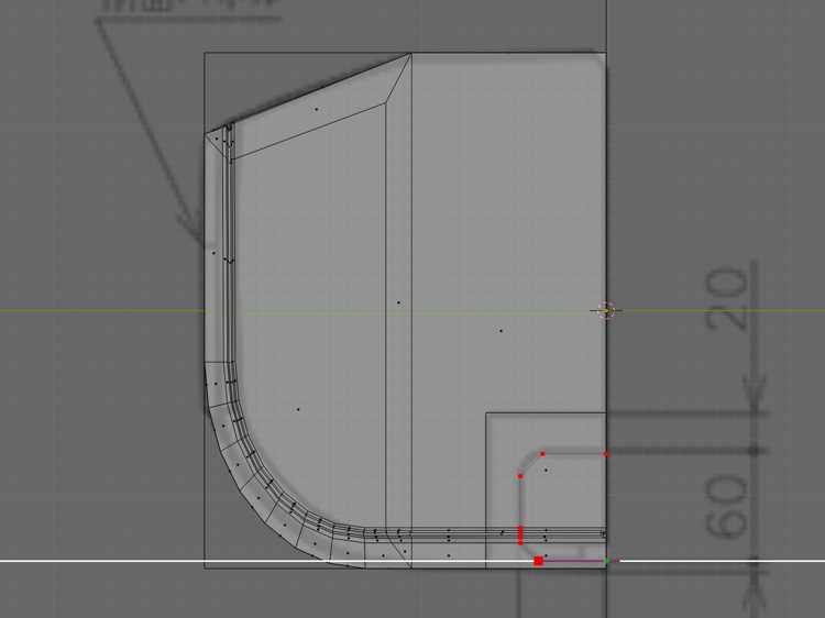 「3」+「5」でライト・平行投影表示にします。側面にも二面図を追加して、ガイドオブジェクトと合わせます。こうすることで、実寸サイズでモデリングすることができます。