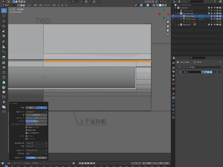 エアコン正面の底面の辺を選択して、「Ctr」+「B」で辺にベベルをかけ、セグメントを7に設定します。
