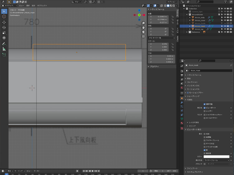 「Shift」+「A」で平面を追加し、Xを0.33m、Yを0.003m、Zを0.058mにします。名前をAircon_maskにします。
