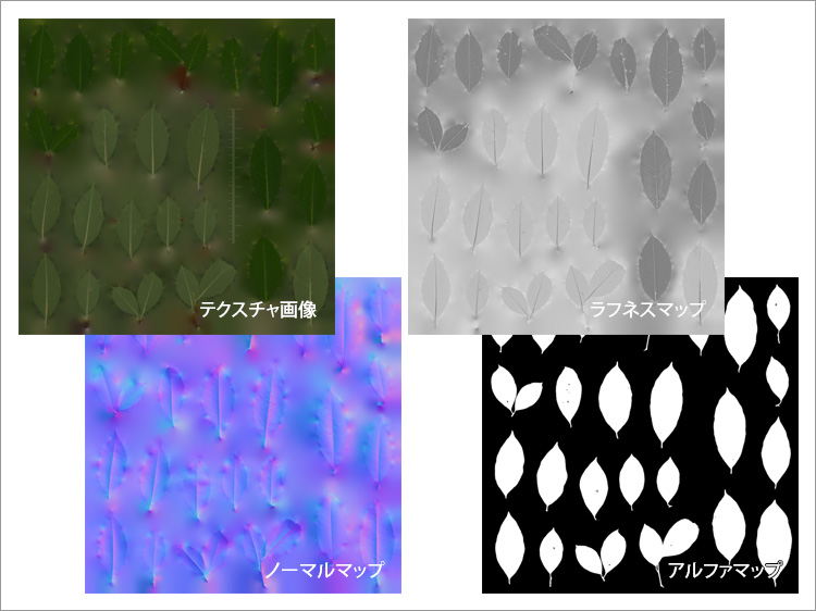 3D SCANNED CHERRY TREE LEAVES ATLAS 01Bには、テクスチャ画像の他にラフネスマップやノーマルマップ、アルファマップが用意されています。