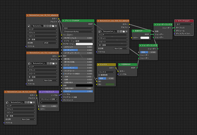 葉のテクスチャを設定します。テクスチャ画像の他に、ラフネスマップやノーマルマップ、アルファマップも設定します。テクスチャの設定方法は「Blender2.8でテクスチャを設定」を参考にしてください。