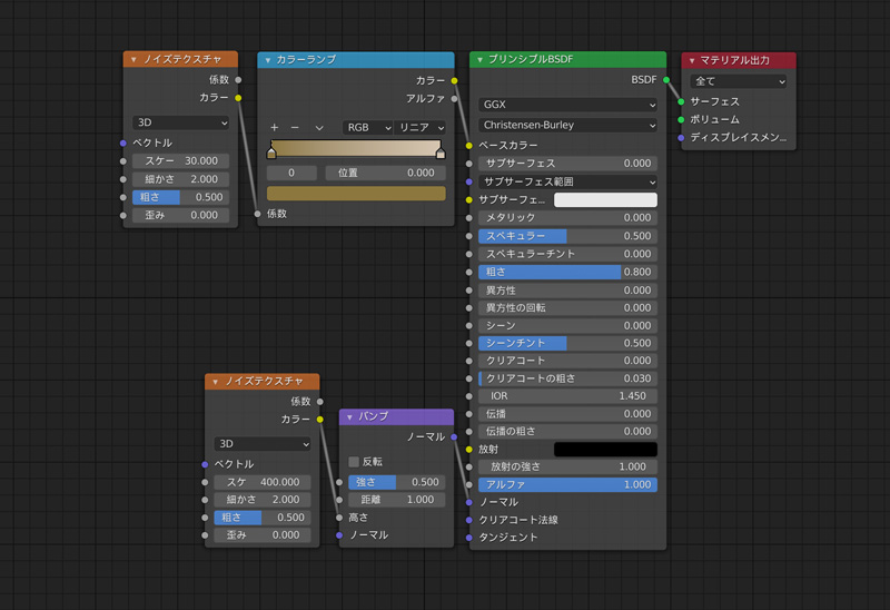 土のテクスチャを設定します。テクスチャ画像の他に、ラフネスマップやノーマルマップ、ディスプレイスメントマップを設定します。