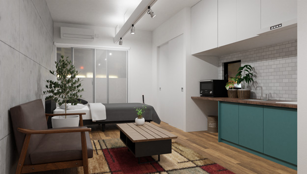 botaniqを有効化すると、プロパティ(「N」で表示)にpolygoniqが追加され、Spawn Assetから植物を追加できるようになります。「CGWORLDのチュートリアルで部屋モデリング(1)」で制作したリビングにbotaniqの植物を置きました。