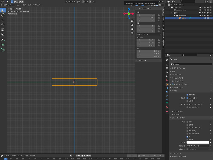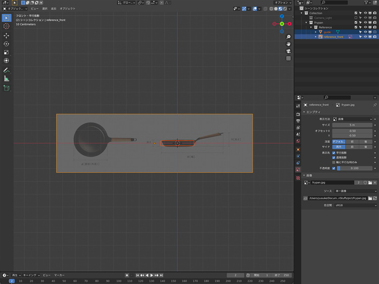 「Shift」+「A」+「画像」で二面図を追加し、二面図の不透明度を0.1に設定、「S」で二面図とガイドオブジェクトを合わせます。
