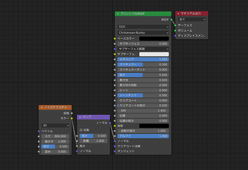 フライパンのマテリアルを設定します。メタリックを1.0にして、ノイズテクスチャで細かい凹凸を表現します。マテリアルの設定方法は「Blender2.8でマテリアルを設定」を参考にしてください。