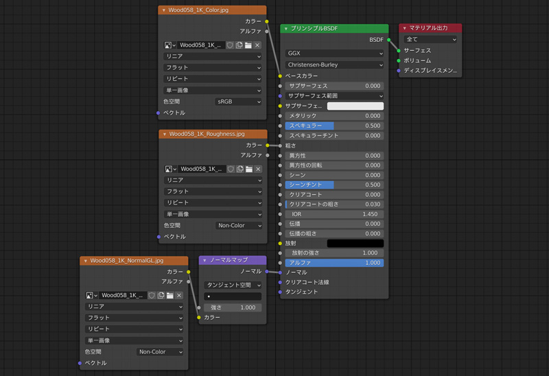 木目のテクスチャを設定します。テクスチャ画像の他に、ラフネスマップやノーマルマップを設定します。テクスチャの設定方法は「Blender2.8でテクスチャを設定」を参考にしてください。