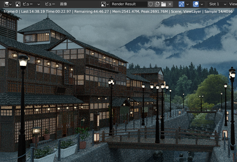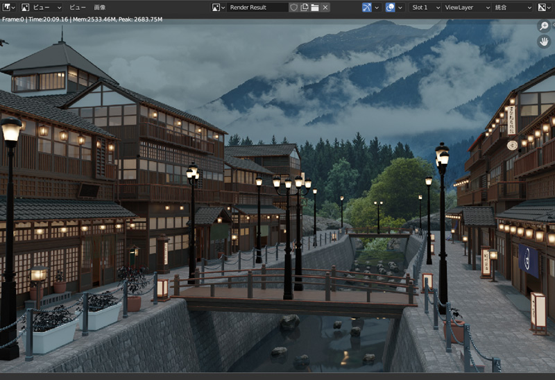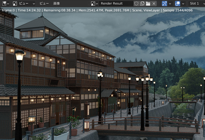 レンダリング用に、Youtubeのチュートリアル動画を参考に温泉街を制作しました。それでは、Cycles Xで温泉街をレンダリングします。