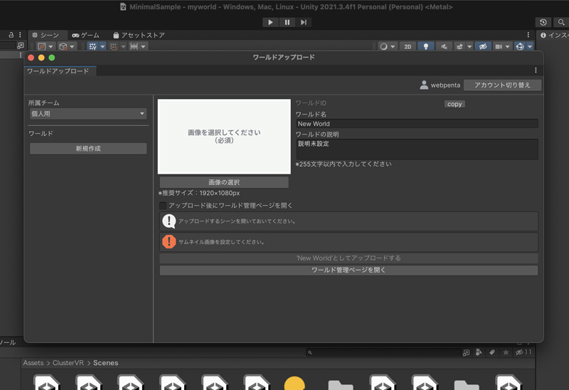 「clusterのワールド制作環境を構築」で制作環境を構築しましたが、引き続きclusterのワールドアップロードを試しました。