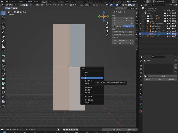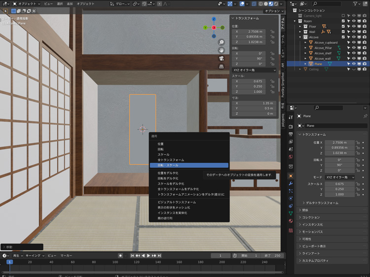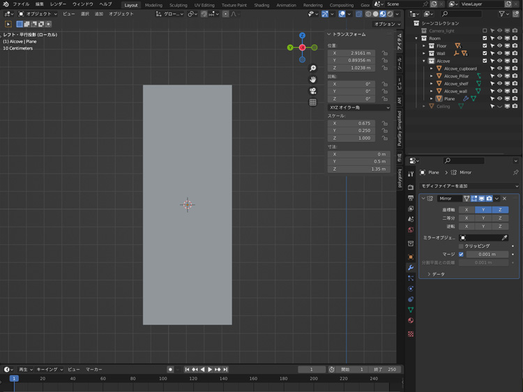 「Shift」+「A」で平面を追加します。「R」+「Y」+「90」でY軸方向に90度回転して、Xを1.35m、Yを0.5mにします。「G」で床の間に移動します。