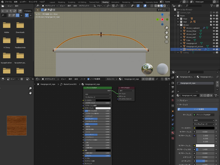 掛け軸と掛け紐、フックにマテリアルを設定します。マテリアルの設定方法は「Blender2.8でマテリアルを設定」を参考にしてください。