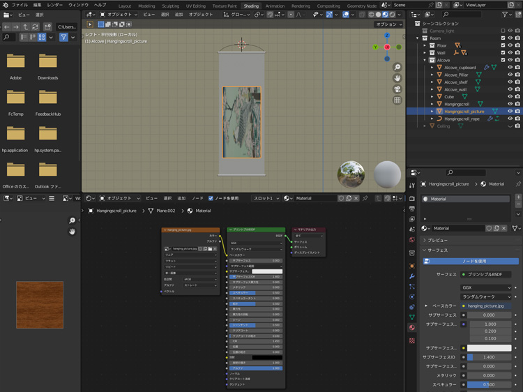 掛け軸とは別に追加した平面にテクスチャを設定します。テクスチャの設定方法は、「Blender2.8でテクスチャを設定」を参考にしてください。