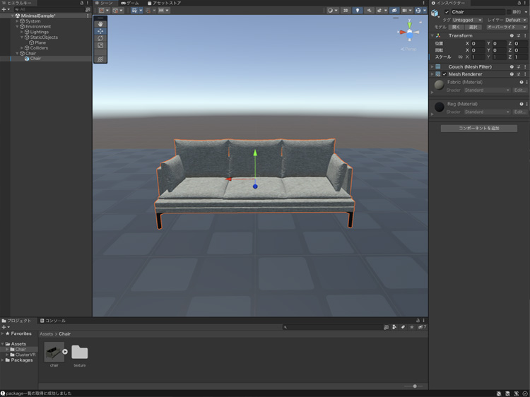 椅子をFBXに出力して、Unityで読み込みます。FBXに出力する方法は、下記を参考にしてください。