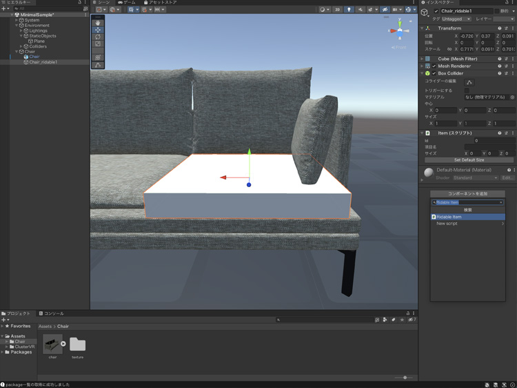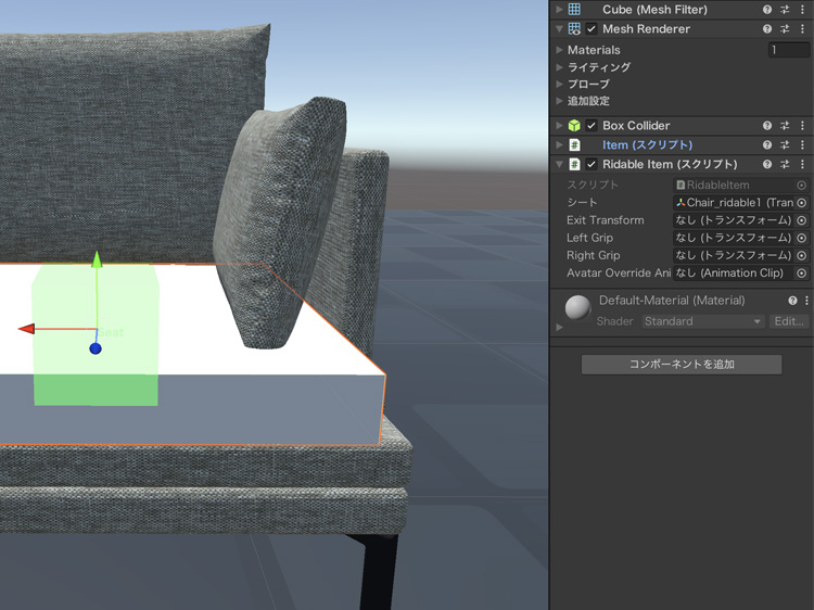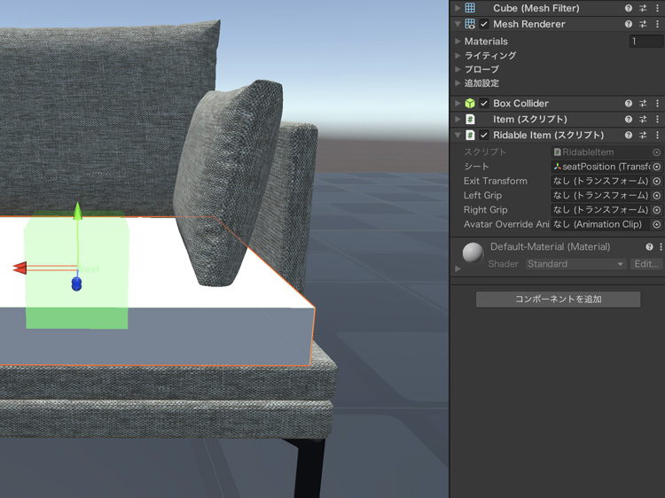 トップバーの「ゲームオブジェクト > 3Dオブジェクト」でキューブを追加して、位置とサイズをソファの座面に合わせます。ゲームオブジェクトは、コンポーネントのRidable Itemを追加すると座れるようになります。キューブのインスペクタで「コンポーネントを追加」をクリックして、Ridable Itemを追加します。