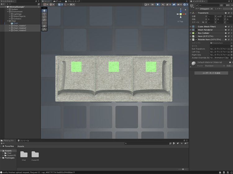 clusterのワールドの椅子(座れるオブジェクト)を制作しました。