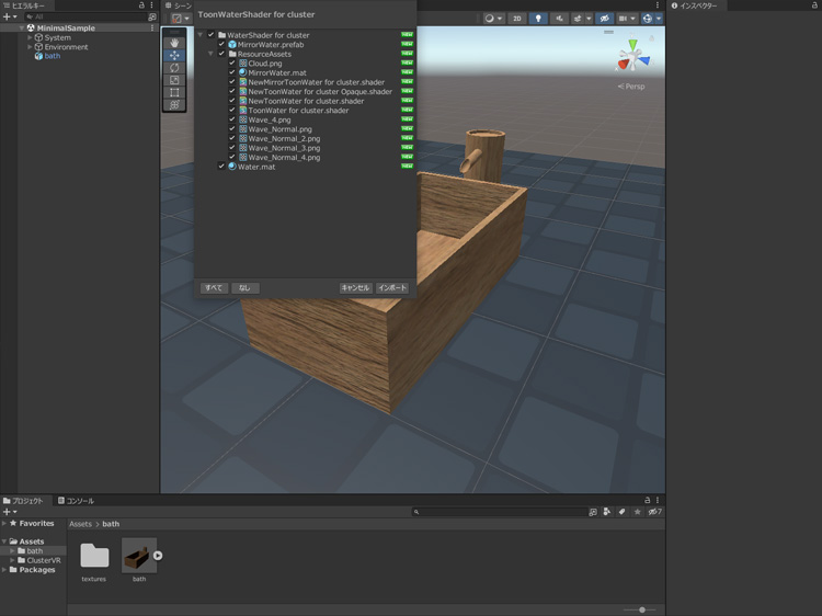 ToonWaterShader for clusterをダブルクリックして、Unityのプロジェクトにインポートします。