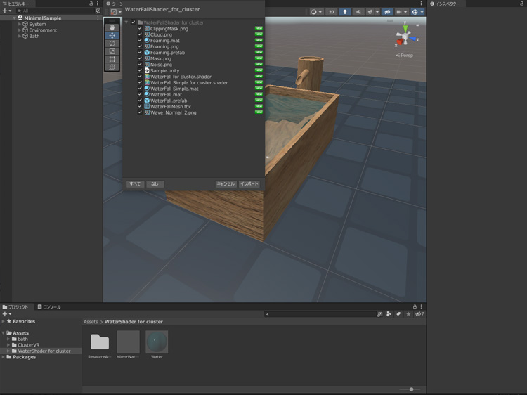 WaterFallShader_for_clusterをダブルクリックして、Unityのプロジェクトにインポートします。
