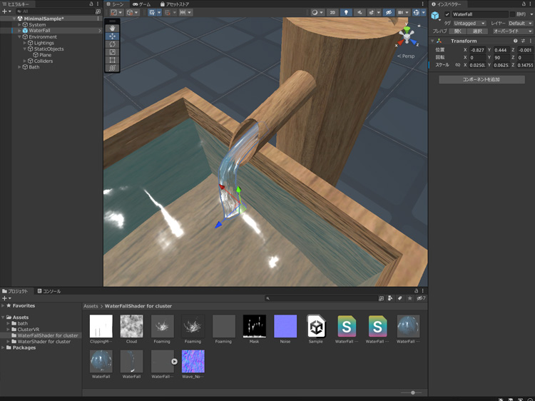 「Assets > WaterFallShader for cluster > WaterFall」をシーンにドラッグアンドドロップして、位置とサイズを調整します。