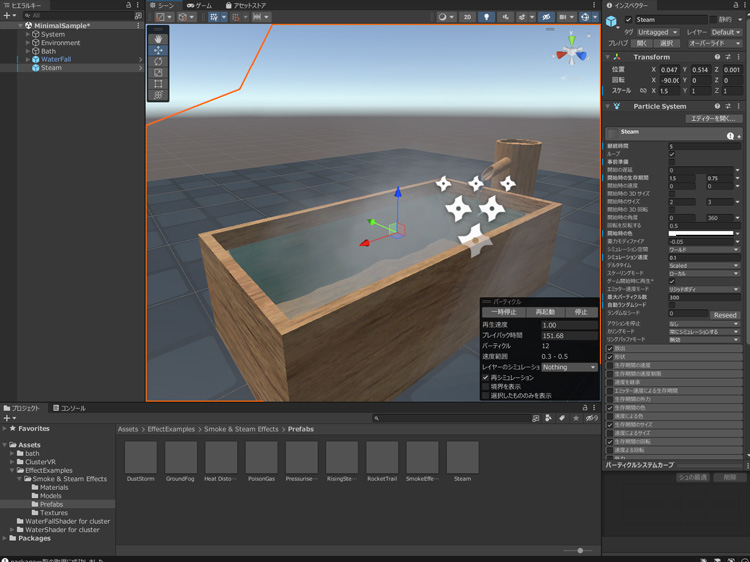 「Smoke & Steam Effects > Prefabs > Steam」をシーンにドラッグアンドドロップして、湯気を追加し、位置を調整します。
