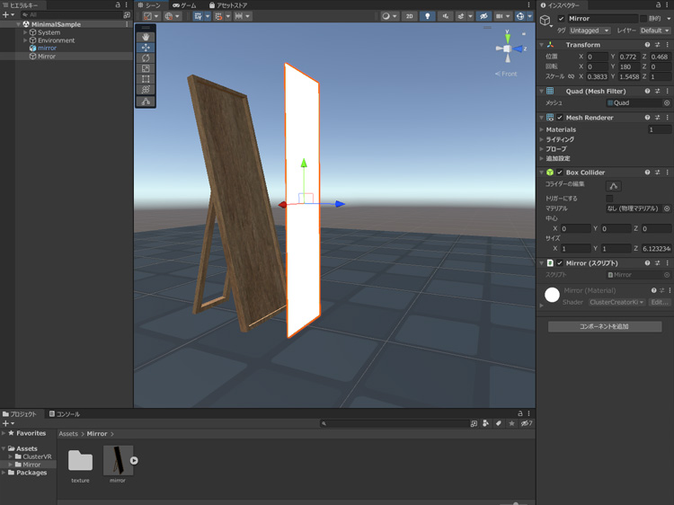 トップバーの「ゲームオブジェクト > 3Dオブジェクト > Mirror - cluster」で鏡を追加します。