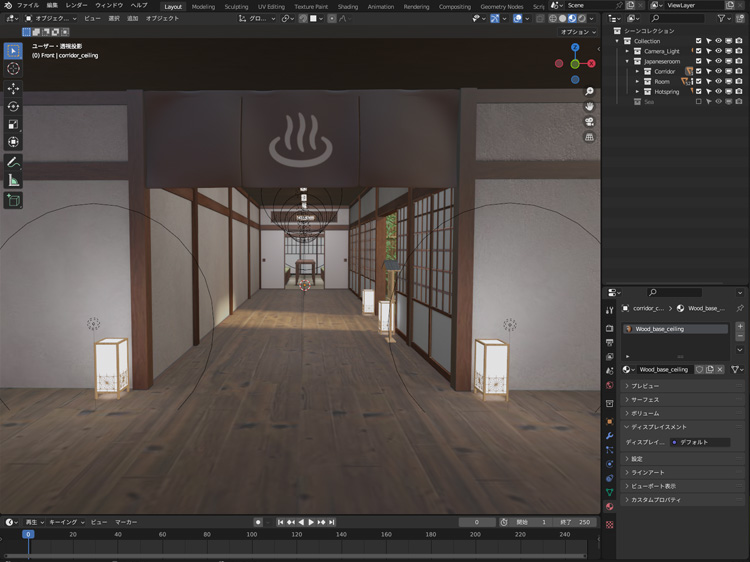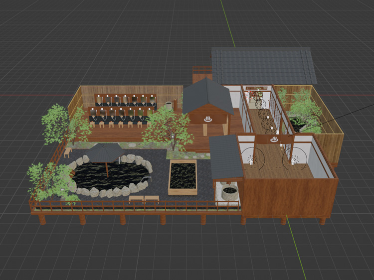 温泉ワールドは、モデリングとテクスチャの設定、ライティングまで完了しています。