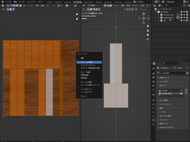 編集モードにして「A」でオブジェクトを全選択して、「U」+「スマートUV投影」でUV展開します。