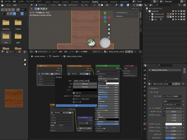 「Shift」+「A」+「テクスチャ」で「画像テクスチャ」を追加します。「+新規」をクリックして1024px×1024pxの画像を作成し、「画像テクスチャ」をアクティブにします。