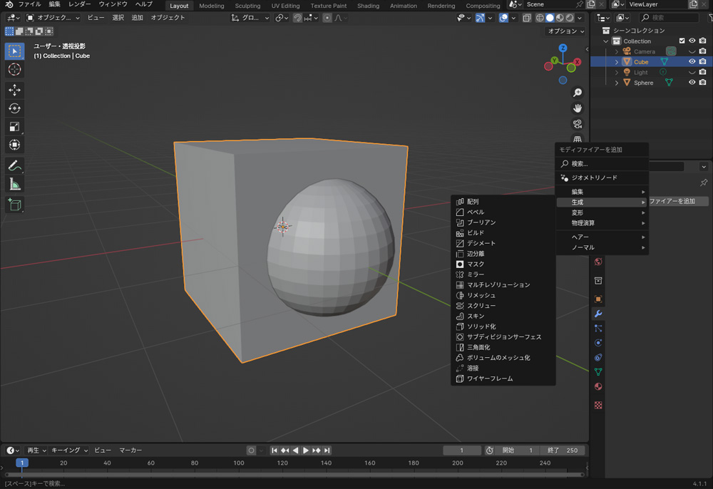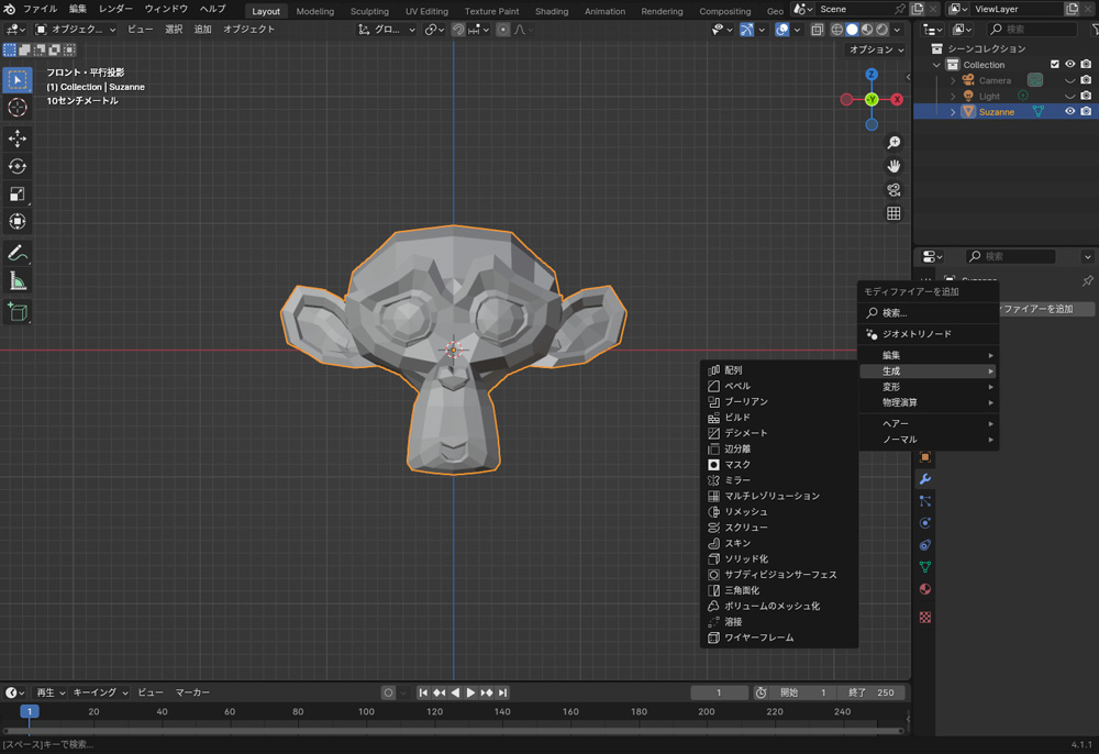 モディファイアーを使用するには、オブジェクトを選択し、プロパティの「モディファイアー」タブで「モディファイアーを追加」から使用したいモディファイアーを選択します。