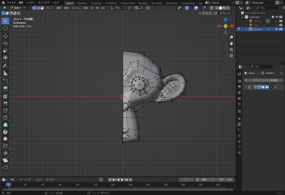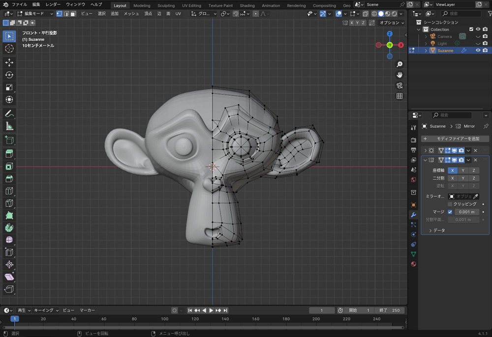 ミラーは、原点を中心にオブジェクトを対称的に複製するモディファイアーです。ミラーを使用すると、片方を編集すると編集内容が反対側にも自動的に反映されます。