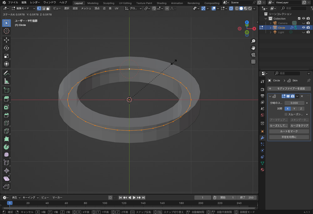 スキンを使用するには、「モディファイアー」の中から「スキン」を選択します。スキンの厚みは、編集モードにしてCtrl+Aで調整できます。スキンは、サブディビジョンサーフェスと組み合わせることで、パイプやケーブルなどを制作することができます。