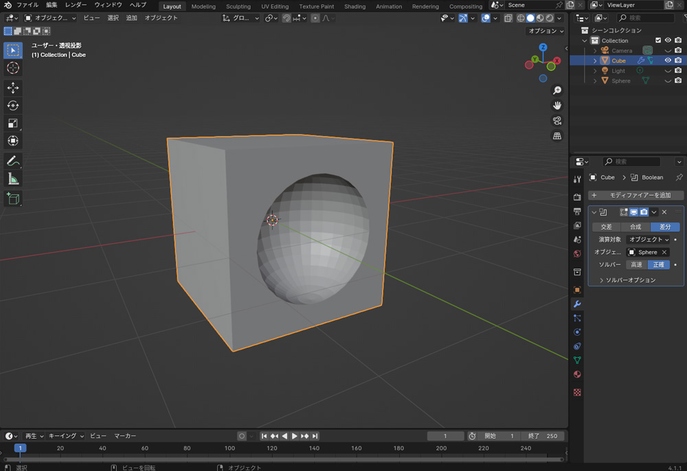 ブーリアンは、オブジェクト同士が重なっている部分を切り抜いたり結合したりするモディファイアーです。