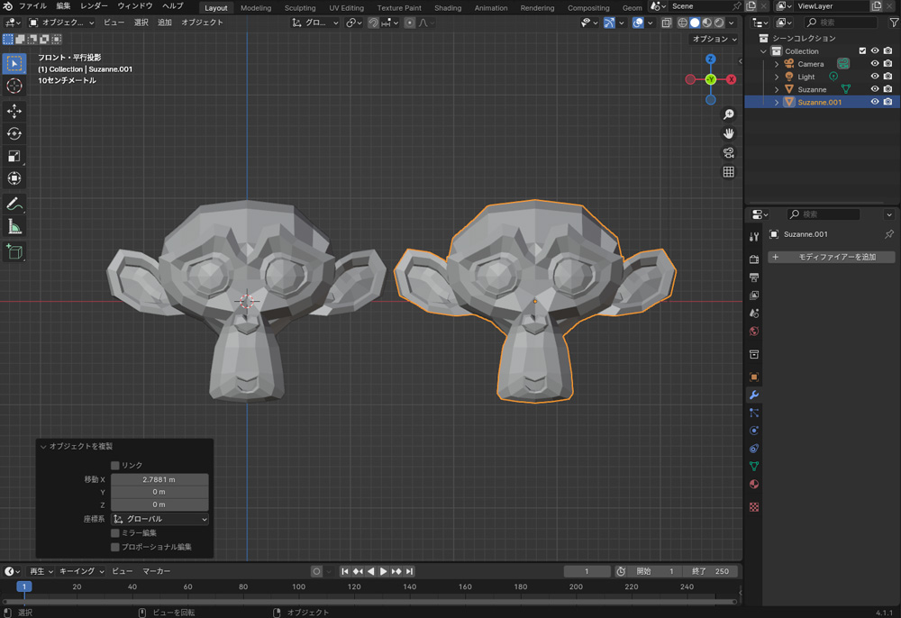 オブジェクトやメッシュ(頂点、辺、面)は、Shift+Dで複製できます。オブジェクトはAlt+Dでリンク複製をすることができます。リンク複製をすると、複製されたオブジェクトがもとのオブジェクトとにリンクされ、変更がリアルタイムで反映されます。