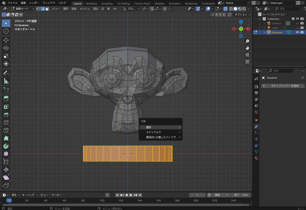複数のオブジェクトを選択してCtrl+Jを押すと、それらのオブジェクトを一つに結合できます。結合後、アウトラインは同じオレンジ色に変わります。また、オブジェクト内の一部のメッシュを選択してPを押すと、その部分を別のオブジェクトとして分離できます。